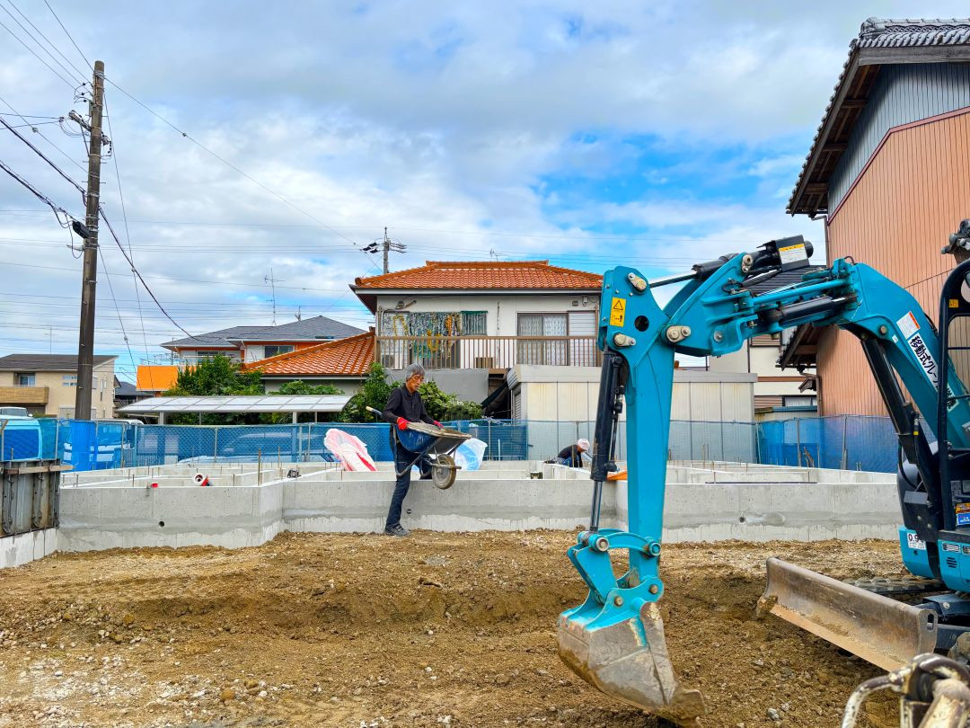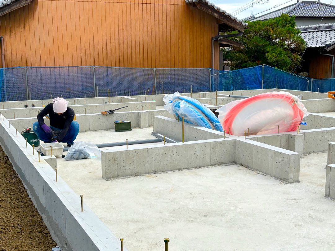基礎まわりの整地作業と並行して給排水の配管工事が進行中です。