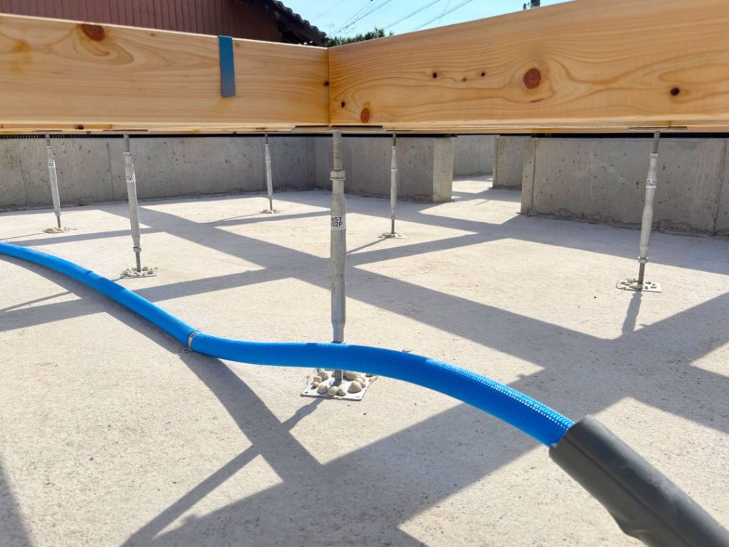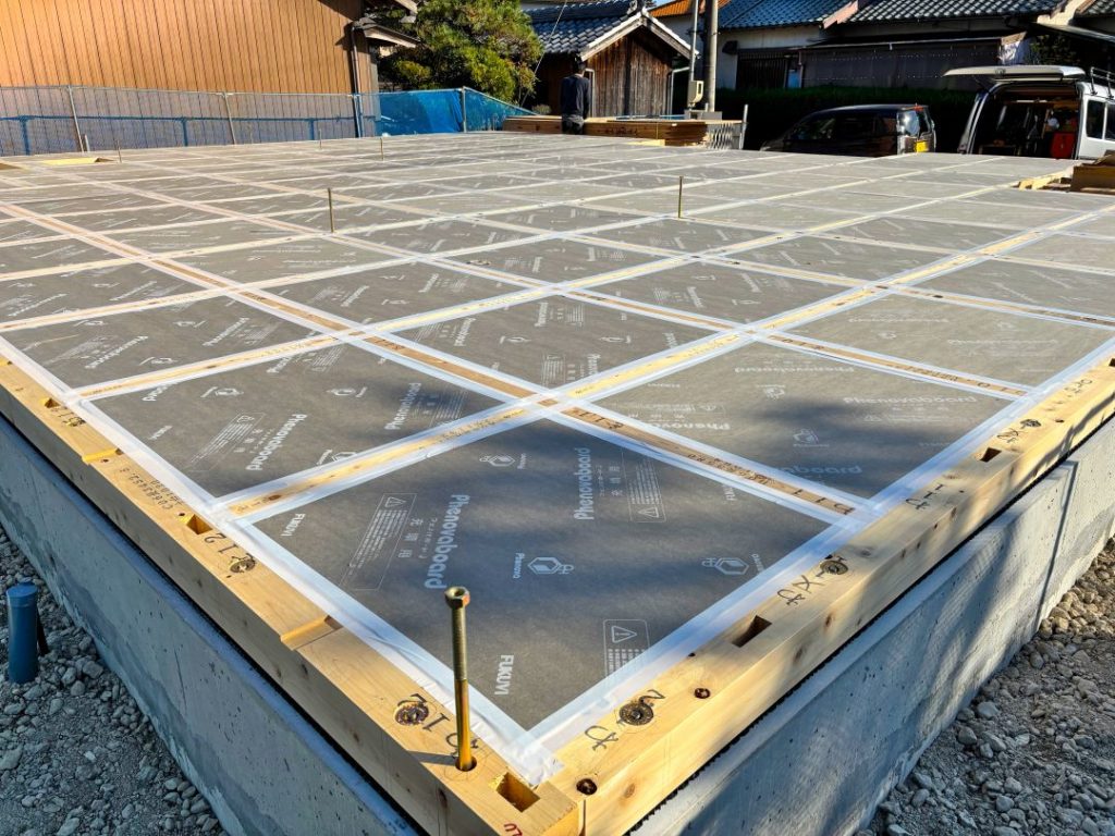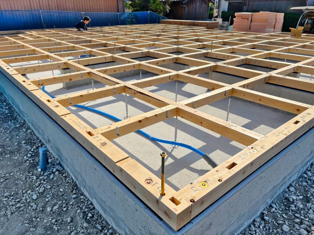 完成した基礎の上にこれから建てられるお家の土台となる木材が敷かれました。