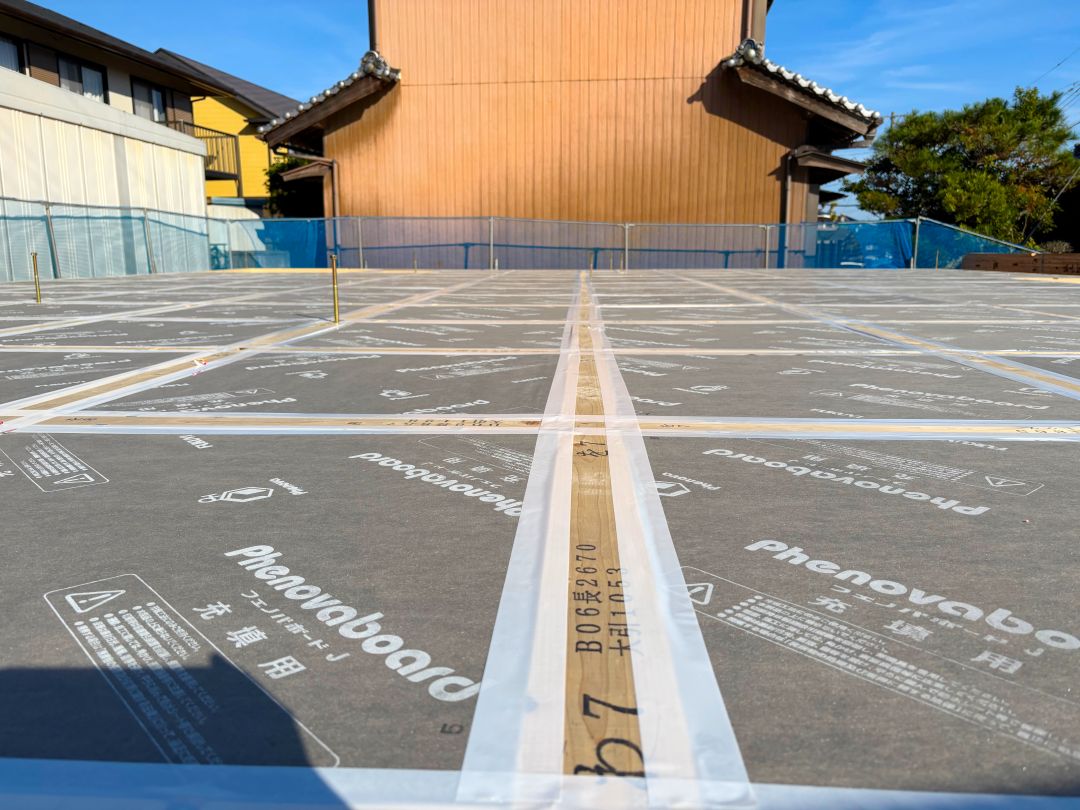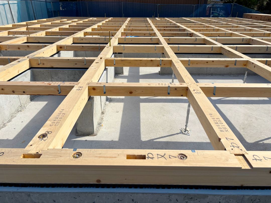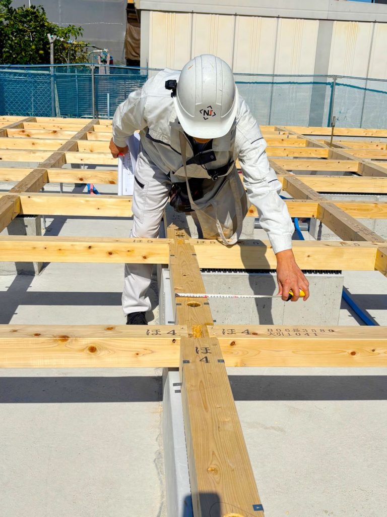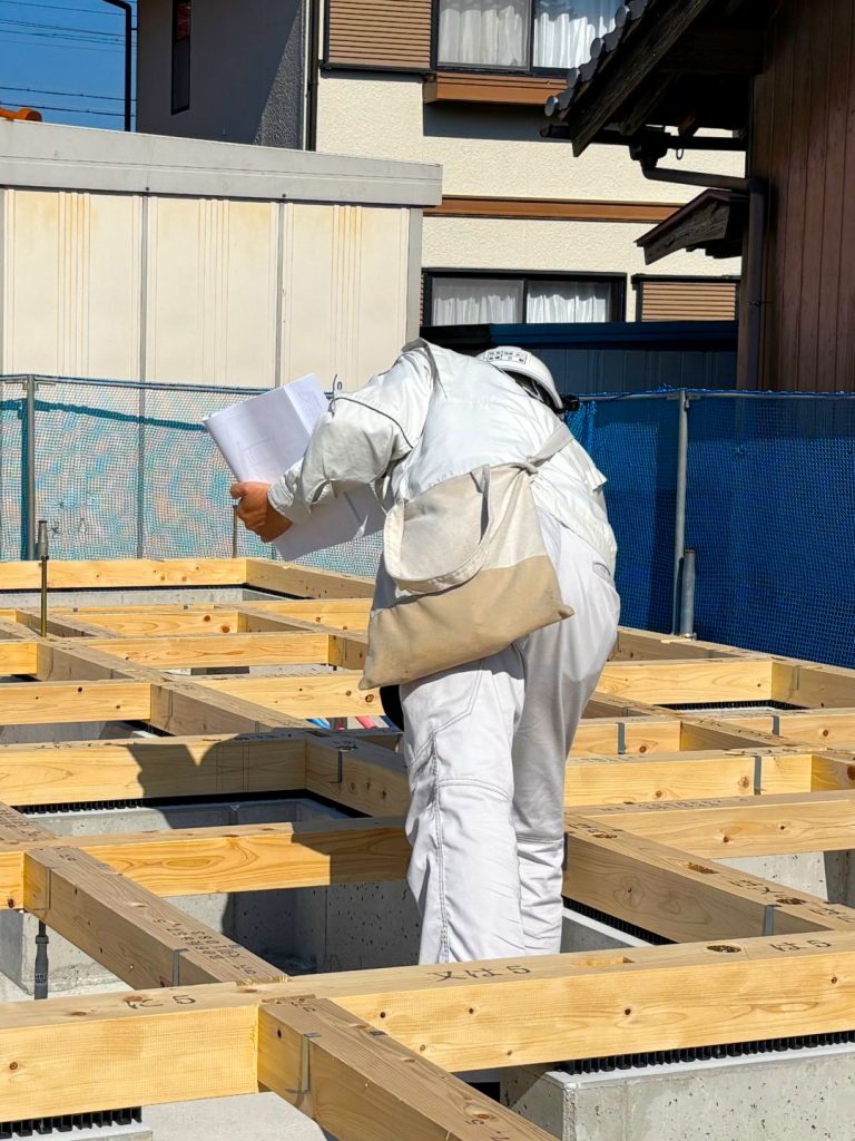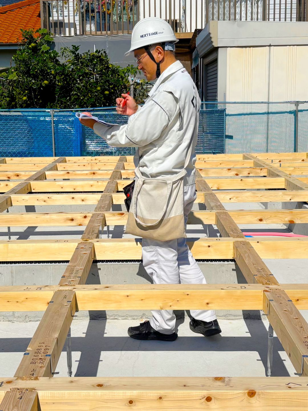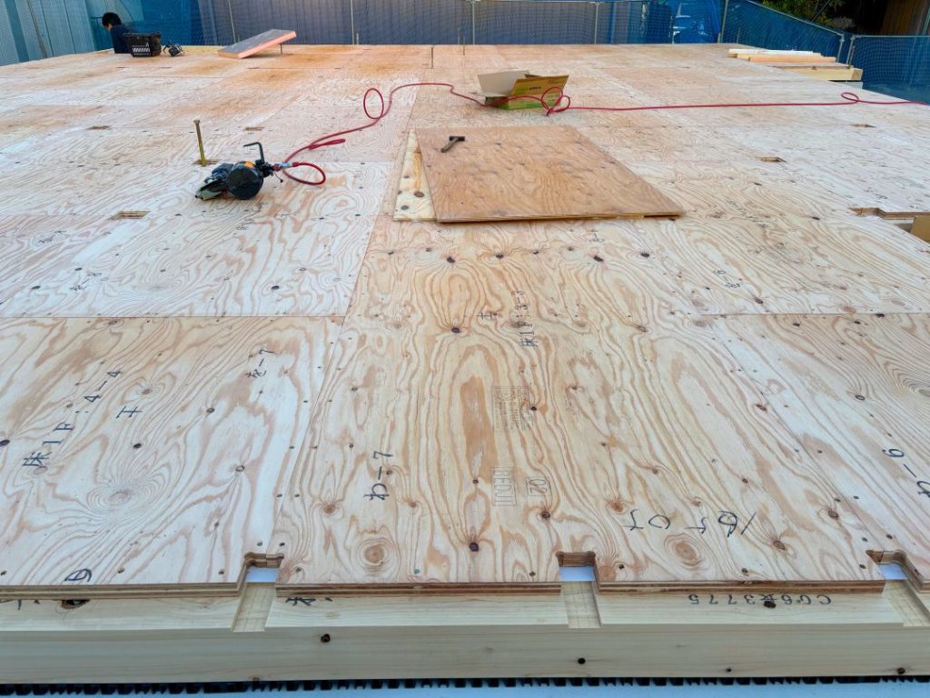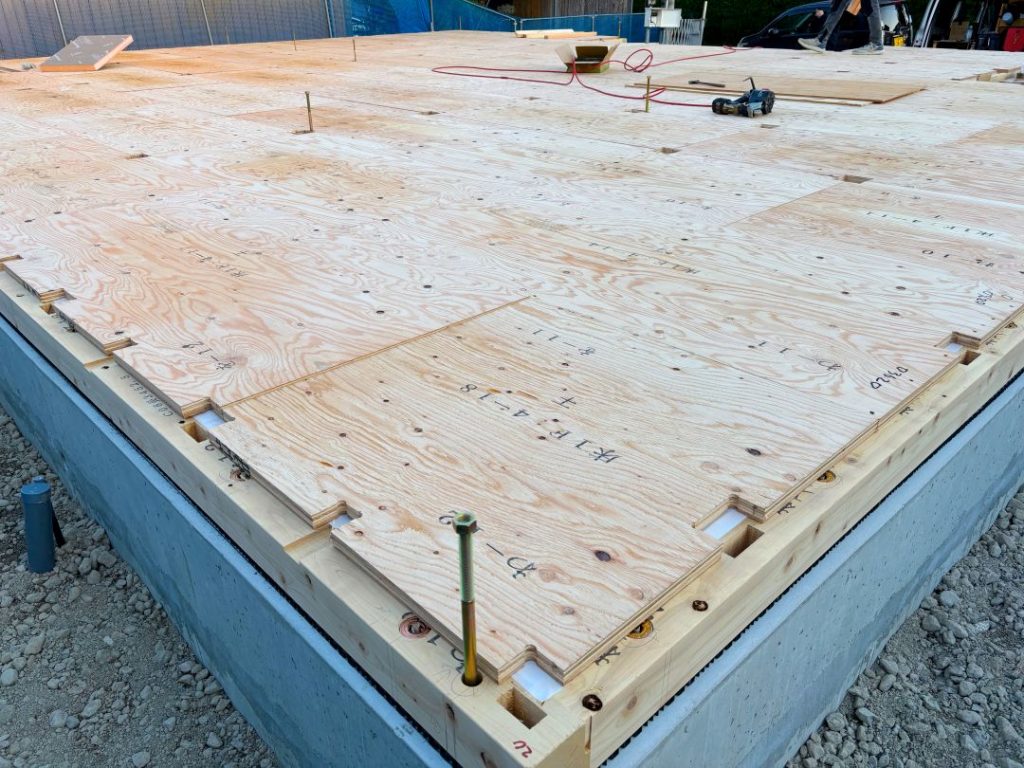 監査が済んだら土台の木材の間に床断熱材を敷き詰め、その上に床板が敷かれました。
