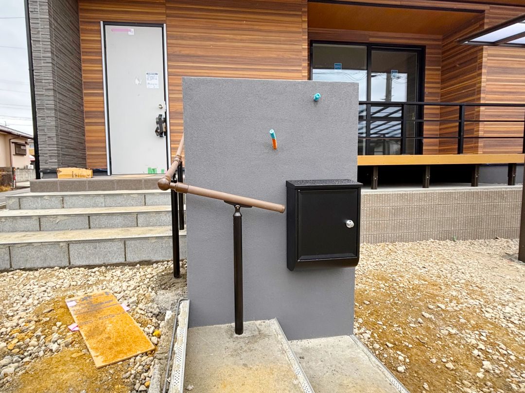 門塀の造作が終わり、ポストが付きました。 玄関までの階段の施工中です。