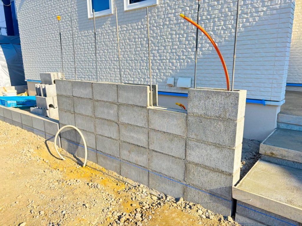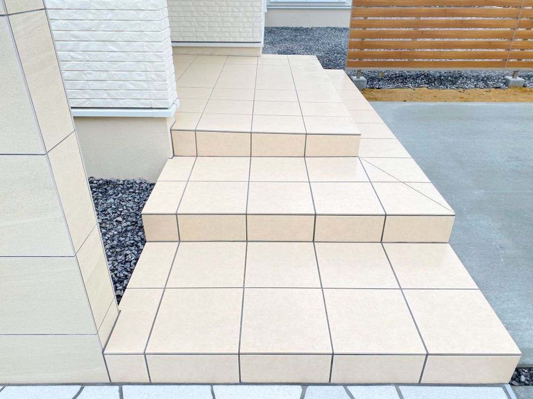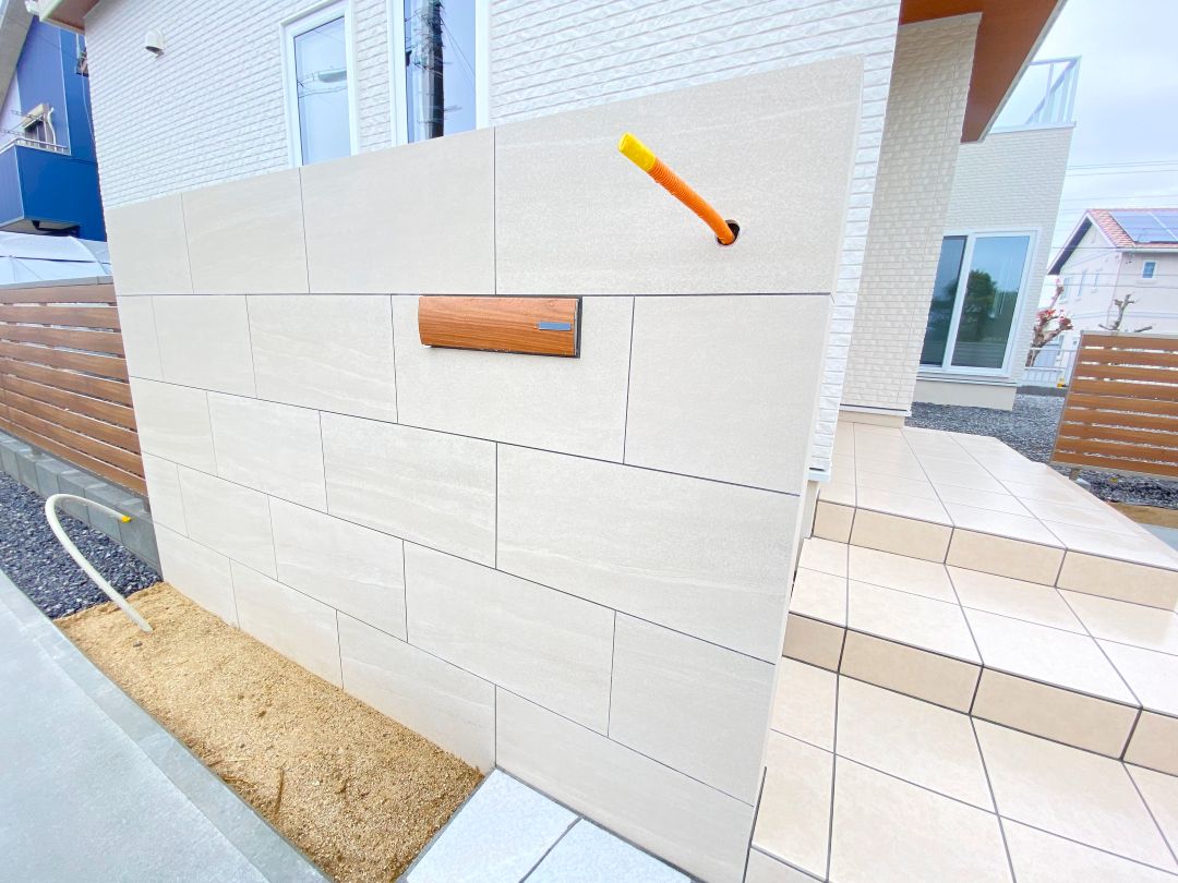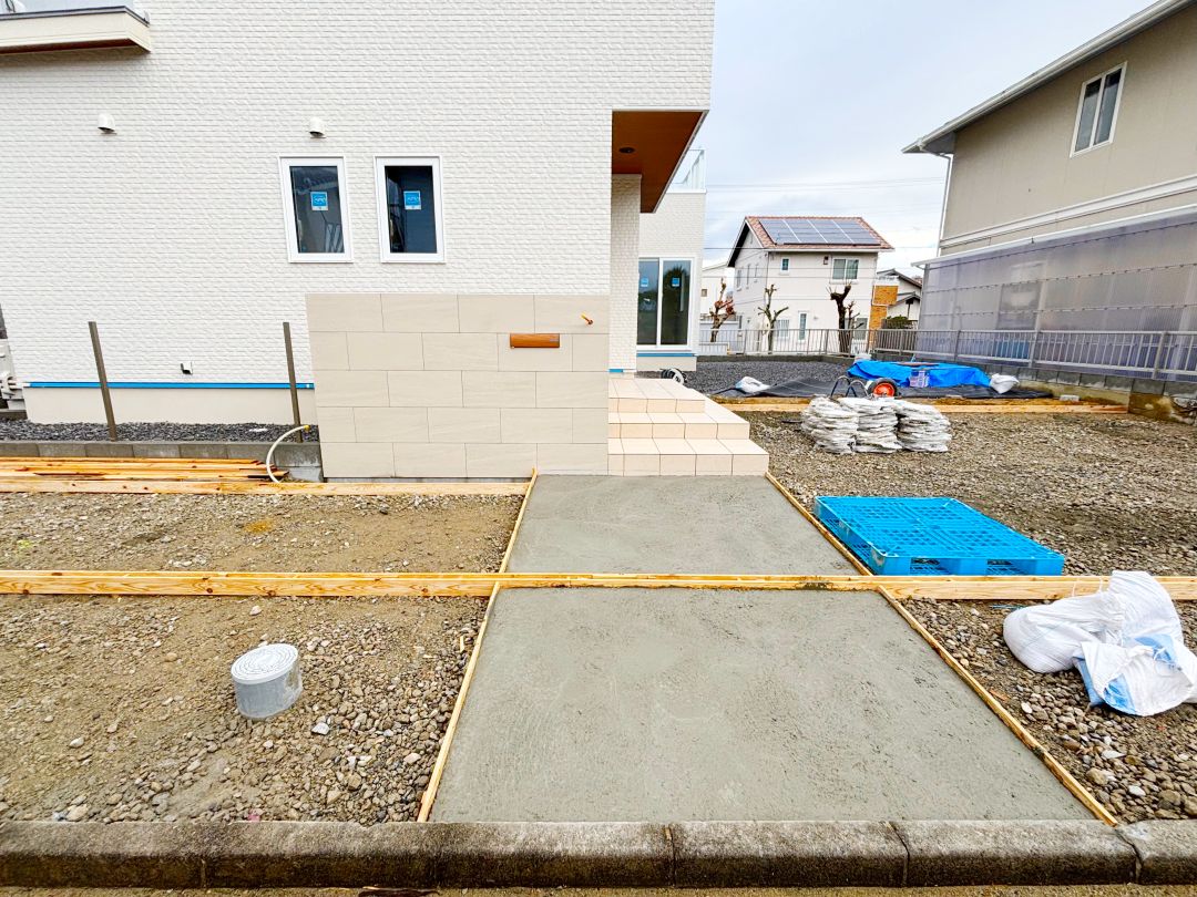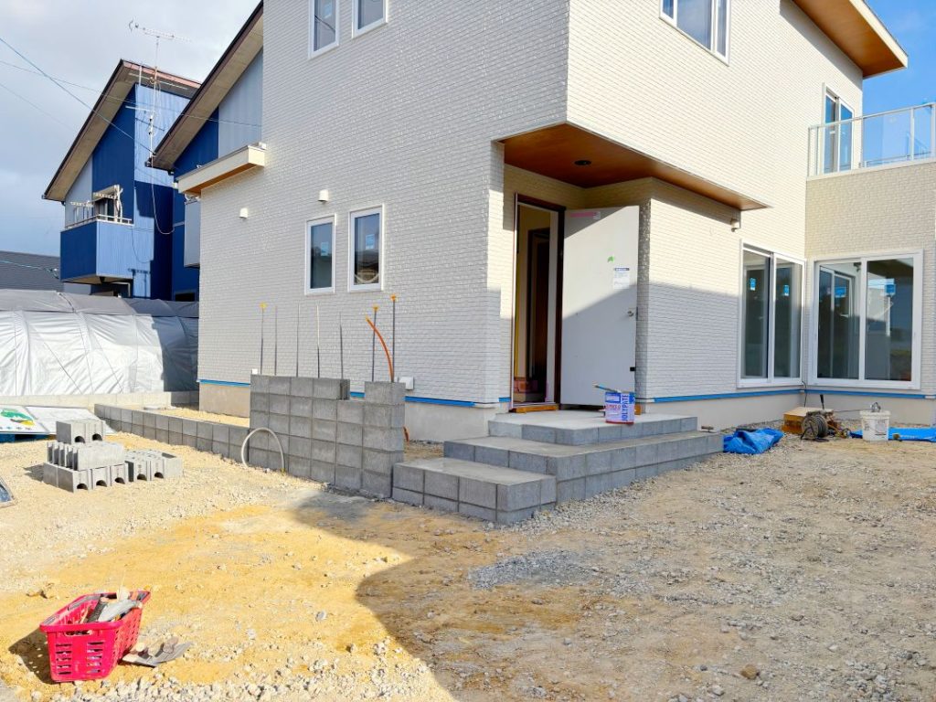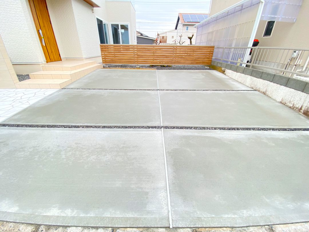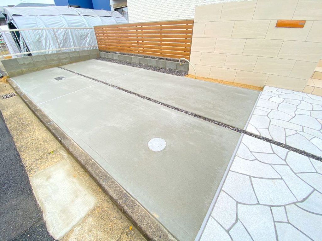 玄関へのアプローチ・駐車場やフェンスの施工も終わり、ほぼ完成に近づいています。
