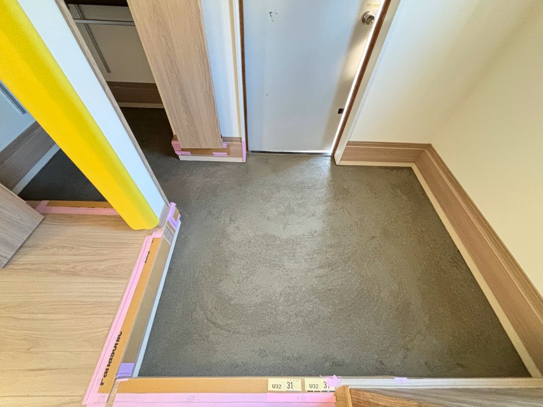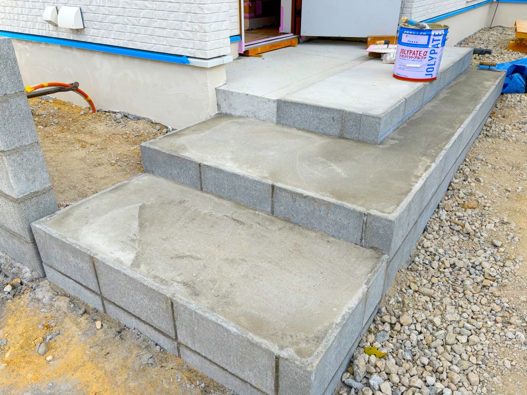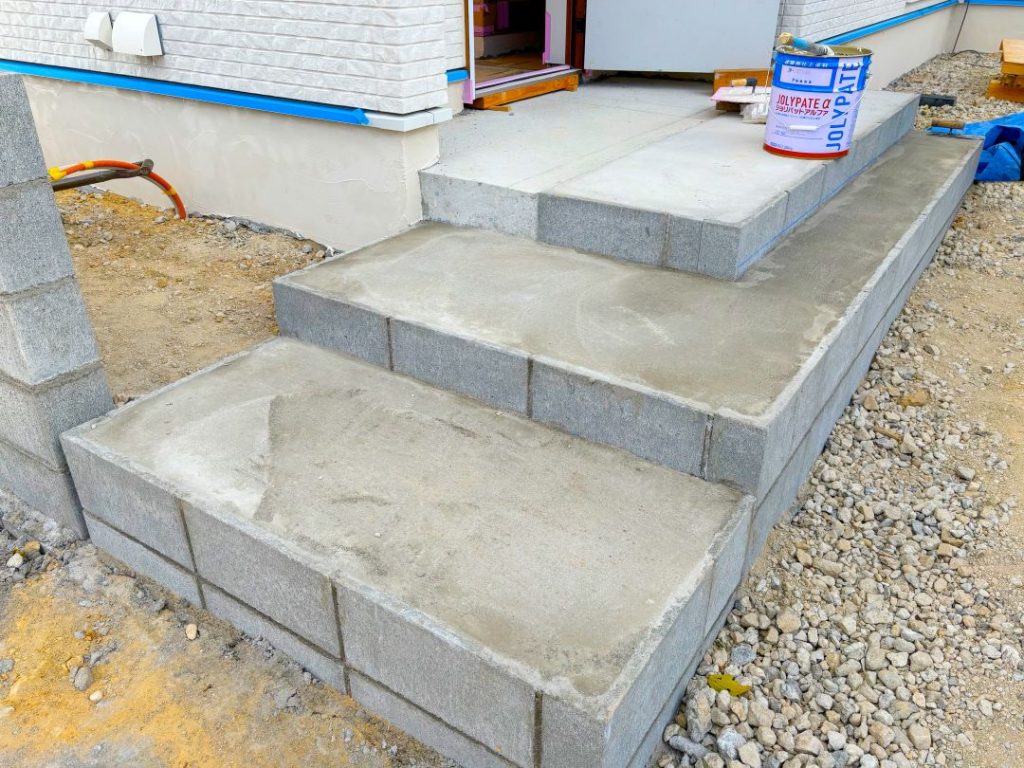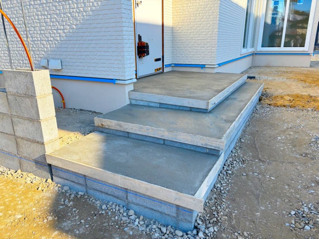 玄関まわりから進行中! 玄関内外のタイルの下地となるポーチや階段部分が造られています。