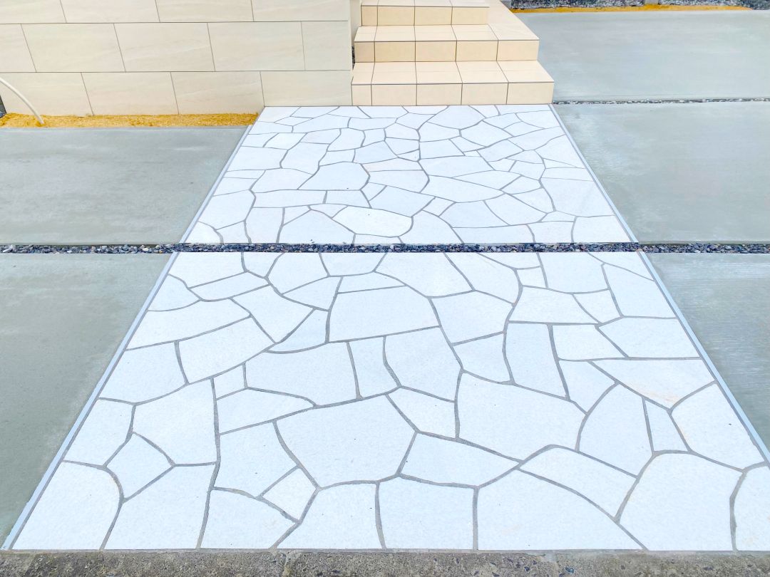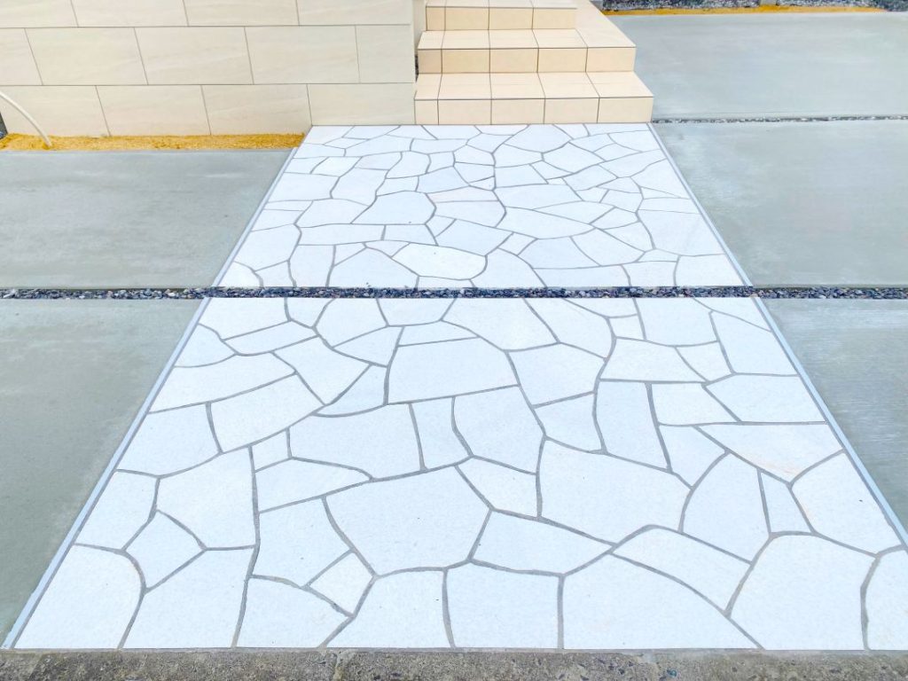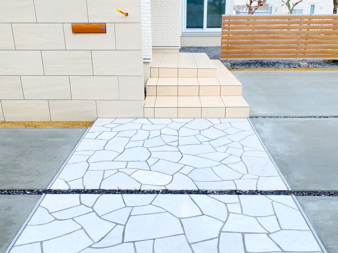 乱形石張りのアプローチが目をひく仕上がりとなっています。