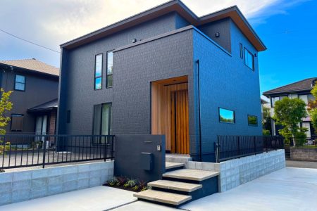 青空に映えるグレーと黒のコントラスト シャープな印象のシンプルモダンな外観 余裕のある